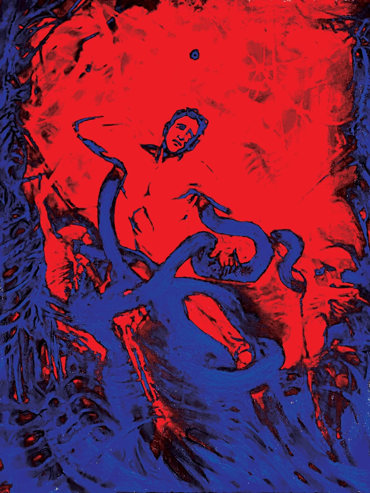 One of the first pieces I made in this series. Originally made in chalk pastel and digitally edited because I wanted the colors to hurt more. Entropy takes inspiration from the historical statue Laocoön and His Sons. I was reminded of a paper I had written in college that described that piece as the moment before everything falls apart. Moment before disaster. I found that interesting.